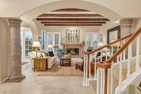 Experience the rewards of luxurious and carefree coastal living at this exceptionally rare townhome in La Jolla’s gated Villas of Ivanhoe enclave. Highlighted by one of the community’s largest and best-positioned patios, the former model residence showcases a host of preferred upgrades and appointments in a two-level living environment that is bathed in natural light and extends approx. 2,530 s.f. An impressive entry door framed by leaded-glass sidelights opens to reveal a double-height foyer that leads to a dramatic circular staircase, a fireplace-warmed living room with beamed ceilings and French doors opening to the patio, and a formal dining room with a bay of floor-to-ceiling windows. Another fireplace and surround sound are revealed in the family room, and the open-concept kitchen is upgraded with granite countertops, contemporary cabinetry, an island with built-in wine storage, an adjacent laundry room, and high-end stainless steel appliances including a Dacor cooktop and a built-in refrigerator. Three bedrooms and 2.5 baths are featured, including a sumptuous primary suite with a vaulted ceiling, a fireplace, and a spa-caliber bath with granite countertops, separate vanities, a soaking tub, and a separate shower. Two premium subterranean side-by-side parking spaces and an oversized storage area are included. Limited to just 13 luxurious townhomes, the gated Village of Ivanhoe is located in the heart of La Jolla’s Village, mere moments from La Jolla Cove, world-famous beaches, vibrant shops and restaurants, quaint cafés, golf at the La Jolla Country Club. Sewer: Sewer Connected Topography: LL