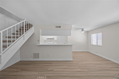 Newly upgraded, totally turnkey unit....very clean & pretty! Located in Villa La Verne Community this light, bright, two level condo features brand new Garrison Rigid Stone Core "Vinylnova" plank flooring entire first level with brand new base molding. Freshly painted, brand new 2" faux wood blinds throughout, brand new remote controlled ceiling fan and all ceilings have been freshly scraped/textured/painted! The kitchen features recently upgraded, white Shaker Style soft close cabinet doors, new soft close drawers and all new brushed nickel hardware. Appliances included are stove, refrigerator and dishwasher. Counters are clean & fresh white laminate, new stainless steel sink and a new faucet too! Living room features an appealing white brick wall and rod iron stair railing to add to the decorator look. Upstairs features a recently renovated, full bathroom with sliding glass shower/tub door, new floor, newer/updated flooring, vanity, light and fixtures. Also upstairs are two bedrooms. The primary bedroom features a spacious walk-in closet and a built in vanity. This unit has a recently upgraded HVAC system and between the the A/C and swimming pools you'll be cool and comfortable all summer long! The Villa La Verne Community is perfectly situated .4 miles walk to Target shopping center where a brand new, popular Trader Joe's Store is opening soon! The community features HOA swimming pools, play area and recreation/activity center. Additionally the development is located adjacent to the Las Flores community park which features, swimming lessons, swim team and water polo at the aquatic center as well as awesome playgrounds, BBQ/picnic/party areas, soccer field, tennis and pickle ball courts! The HOA dues covers water, trash and exterior grounds and building maintenance. The condo has one garage parking space and one assigned driveway parking space. There is a shared laundry room next to the garage.