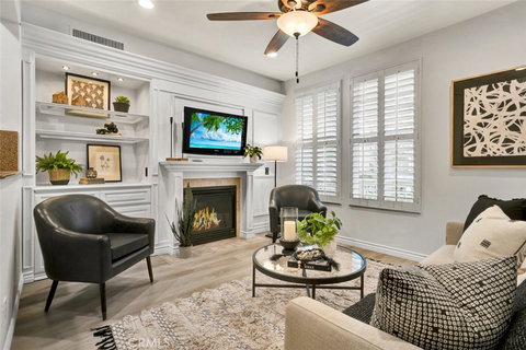Nestled in the heart of Ladera Ranch along a quaint tree-lined street, this 3 bedroom, 2.5 bath home provides 1,560 square feet of living space. The classic front-porch brings southern charm with white wooden railing and brick trim accents that welcome you to the front door. As you enter the home, the high ceilings immediately provide a spacious feel to this open-concept home. The family room features a gorgeous formal fireplace with wood mantel and custom accent built-in wood shelving to showcase your family décor with timeless elegance. The pass-through window from the kitchen to the family room is perfect for entertaining, as it allows the cook to continue to socialize with guests without missing a beat, and a countertop to offer hors d’oeuvres to guests. The gourmet-style kitchen with adjacent dining area offers stainless steel appliances, plenty of cabinet space, custom full granite backsplash, and a comfortable place to enjoy meals. Follow the stairs up to the primary suite with a walk-in closet; primary bath with dual sinks, and a separate tub and frameless glass shower with decorative tile; and a large balcony. Charming secondary bedrooms are both light and bright with generous closet space and a full hallway bath adjacent. The dedicated upstairs laundry room includes linen cabinets that offer ample storage space with additional storage available in the hallway linen closet. As you tour the home, you will also find many upgrades which include plantation shutters, hardwood-style and ceramic flooring, tall baseboards, and recessed lighting. The home also includes a 2-car garage and is a short walk to Creighton Plunge Pool and playground. Walking distance to Oso Grande Elementary, Ladera Ranch Middle School, Ladera Ranch Library, Founder’s Park, Avendale Clubhouse, Wagsdale Dog Park, and other community walking trails. Enjoy all the award-winning community amenities that Ladera Ranch has to offer!