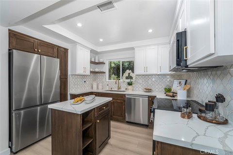 The chef-inspired kitchen boasts quartz countertops, a floating center island with additional storage, a Samsung French-door refrigerator, full stainless and black appliance suite, white shaker upper cabinets, dark lower cabinetry, and a stunning patterned tile backsplash—all illuminated by adjustable LED lighting. Retreat to the luxurious primary suite, where octagon-patterned tile flooring meets a spa-like bath featuring a marble-topped vanity with dual mirrors, light wood cabinetry, and a marble walk-in shower with rain-style showerhead, built-in niche, and seating. The suite also offers a triple-door mirrored wardrobe, LED lighting, and serene views. The secondary bedroom includes plantation shutters, recessed lighting, and mirrored closets. The remodeled guest bath offers white cabinetry with gold accents, a textured accent wall, and a designer tile and glass-enclosed shower. The spacious flagstone patio invites you to unwind with panoramic views of Saddleback Mountain, Irvine Valley, and lush greenbelts that surround the building. As part of Laguna Woods Village, Southern California’s premier 55+ community, you’ll enjoy access to resort-style amenities including seven clubhouses, five pools, two professional golf courses, tennis and pickleball courts, fitness centers, over 250 clubs, and 24-hour gated security—all just minutes from Laguna Beach.