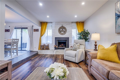This fully remodeled townhome is situated in the prime location of Lake Balboa. The formal entry welcomes you to a spacious bright living room with a fireplace, dining room, and a slider that leads to a massive patio built for dining, entertaining, and relaxing. A sensational kitchen across to the dining area offers a Center-Island, fresh counters, and a great set of stainless-steel appliances. The window in the kitchen overlooks the entrance and brings even more light and energy to this townhome. A gorgeous powder room and direct access to the two car garage are located on the opposite side of the main floor completing this level. The staircase is highlighted with designer lighting and a characteristic window that allows natural light to shine through. Upstairs, you'll find a spacious primary bedroom with vaulted ceilings, a balcony, a walk-in closet, and an exquisite private bath. In addition, there are two bright bedrooms and a stylishly updated bath hall. All of the rooms are private and distinct from one another. This beautiful townhome has easy access to the community pool and has so much more to offer that it meets everyone's expectations. Nest thermostat, recessed lighting, and convenient guest parking are also included. It goes without saying that this property is centrally located with easy access to the 101 and 405 freeways, Balboa Park and Metro Orange Line Park and Ride.