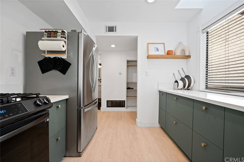 This unit offers brand new waterproof vinyl flooring, brand new paint, and recessed lights throughout. The kitchen is fully upgraded with modern and Scandinavian cabinetry along with ample storage and drawers. White quartz countertops, oversize sink, touch faucet and brand new black stainless appliances such as dishwasher and stove. This unit is the only unit in the complex that offers an extra downstairs bathroom with new tile flooring and fixtures. Both bedrooms are upstairs and feature vaulted ceilings, ample closet space and big skylights that flood the rooms. The hallway bathroom offers shower tub combo. The master bedroom has two large closets and modern new light and fan fixture. Both bedroom attach to a upstairs balcony overlooking a great view of the lake and fountain. The back patio is over filled with landscape, trees and plants and has been renovated with an oversize deck from wall to wall to maximize space and slated fence. The unit has one of the best views of the fountain in the complex from the deck.