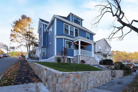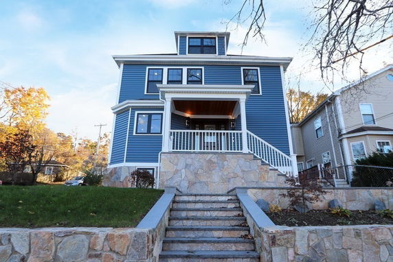 Front view of a two-story blue house with a porch and stone wall.MLS ID #72783096
