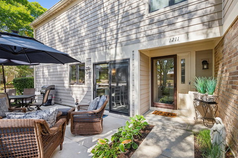 This beautifully renovated 2-story townhouse in Riva Ridge offers modern elegance and comfort. The home has been renovated from top to bottom, featuring three bedrooms and 2.5 baths. This home has all-new flooring throughout for a fresh, cohesive feel. The renovated kitchen has quartz countertops, stainless steel appliances, new cabinets including a pantry cabinet as well as an opening between the kitchen and living area, allowing the chef to be part of the party! Recent updates include a new roof, new siding, updated windows, and a secure sliding door. The light-filled first floor creates an airy, open atmosphere with a dining room and living area accented by a gas fireplace, a cathedral ceiling and three skylights for lovely afternoon light. Upstairs, the primary suite features a charming ship-lap ceiling and an en-suite bath with a soaking tub and Euro-style shower, your own private retreat! Step outside and enjoy the expanded patio surrounded by a private garden set amidst a well-tended lawn and mature trees. The outdoor space is ideal for relaxation as well as entertaining. The oversized garage, refinished with durable epoxy flooring, offers plenty of storage and parking. Riva Ridge Homeowners Association is responsible for exterior work - the lawn, tree trimming, sidewalk and driveway maintenance, and snow removal. The association fees cover the roof, siding, lawn maintenance, water, sewer, trash/recycling and basic cable. Situated in a lovely cul-de-sac close to the green space near the Des Plaines River with multiple walking and biking trails, this move-in ready home perfectly balances modern upgrades with serene outdoor living!