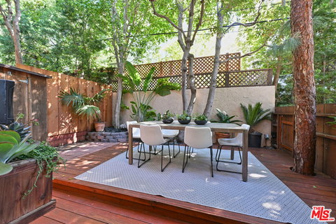 When you step into this updated 2-bedroom, 2-bath rustic architectural townhome, you are in for a wonderful surprise! You are in the heart of Brentwood, at the end of a cul-de-sac, but you will feel like you are in a serene, private country setting. Just a short distance from this ideal location, you can enjoy trendy restaurants, shops, Whole Foods Market, Brentwood Country Mart, a park, recreation center, tennis courts, a dog park and much more. The open living area with wood paneled walls and parquet hardwood flooring, leads to a large, newly updated patio, surrounded by mature trees, providing the best of indoor/outdoor living and the California lifestyle. Imagine the pleasure of cooking in a kitchen with a picture window to nature. Both bedrooms have ample closet space, ceiling fans and their own balconies with tree-top views. Side-by-side laundry is a welcome convenience. Other features include, forced air heating and air conditioning installed in 2019, new tankless water heater, copper plumbing, recessed lighting, large screen living room TV, build-in wine refrigerator, extra storage, plus low homeowners' dues. This woodsy, low-density complex consists of 3 stand-alone townhouse style buildings, with a total of 16 units. Seize this opportunity to live in a tree-filled peaceful setting with all the amenities of Brentwood city life close by.