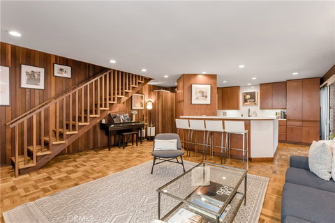 Remodeled MidCentury Architectural Townhouse under $1 million in the heart of Brentwood. Nestled amongst beautiful mature trees at the end of a quiet cut-de-sac, this reimagined retro retreat feels like a house with a spacious, private wraparound turf-covered patio complemented by lush landscape, a fruit bearing loquat tree and Italian string lighting overhead. The “Post & Beam” style interior is accented with redwood paneled walls and original parquet hardwood flooring, keeping the integrity of this vintage home. The first level boasts spacious open living between the kitchen, dining, and living areas; perfect for entertaining. The recently remodeled chef’s kitchen features all top-of-the-line appliances including a Wolf range and KitchenAid French door fridge, caesar stone countertops with eat-in bar, stainless steel farmhouse sink with reverse osmosis water filter, high end fixtures throughout, pantry and tons of storage space. The generous size living room highlights an oversized glass sliding door for a seamless indoor-outdoor flow and connection to nature that surrounds. A stylish reimagined powder bathroom with leaf-themed wall paper rounds out the first floor. The architectural wooden stairway, illuminated by a five-pendant chandelier, leads you to the two sizable bedrooms, each with a private tree-top balcony, ample closet space and wood plank and beam ceilings. The tastefully designed light, bright, and airy full bathroom features a voluminous high ceiling and modern high end finishes. Remote controlled A/C and heating units in living room and bedrooms, assigned parking for 2 cars, laundry access, Ring security and walking distance to Brentwood’s finest amenities including Whole Foods and one of the best Farmer’s Markets in LA. Only the 3rd time on the market since 1965! This is a very special and unique turn-key home. Come see for yourself!