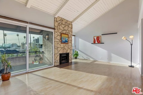 Top floor west facing unit with amazing sunset views. Open living and dining with fireplace, high beamed ceilings and glass slider to balcony that ooze sunlight throughout. Master suite with high beamed ceiling, balcony and 2 large closets.Remodeled kitchen with large walk-in pantry with window letting in light, possibly large enough for study space or office. Convenient elevator across from unit for easy access from secured garage with storage and side by side parking. This rare 3 bedroom has that extra space for home office/ study room with outdoor space. Minutes from the beach and the Santa Monica mountains. Fantastic central location to get around LA easily. Not to be missed!