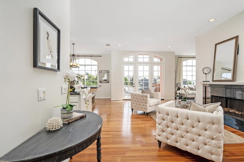 Gorgeous light-filled corner penthouse in the heart of West LA. As you walk into this home the natural light from the multiple skylights, tall ceilings, and abundant oversized windows welcomes you into an open concept living area. Huge chef's kitchen with freshly painted cabinetry overlooks the dining room and flexible living spaces. The private balcony is the perfect place to enjoy the sunrise in the morning, as well as the mountain and city skyline views throughout the day. The main bedroom features vaulted ceilings, a cozy fireplace, and Juliet balcony with city views down to the South Bay. Timeless travertine encompasses the main bathroom, complete with a custom vanity with beautiful quartz counter top. An oversize organized walk-in-closet finishes off the owner's retreat.The generous size 2nd bedroom has an en-suite bath and ample storage. This unique floor plan with space in all the right places is the one you've been waiting for!