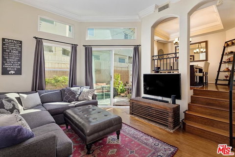 Ready to experience laid-back LA living in a chic townhome? Bursting with character, this ideally located Barrington Avenue residence presents a tasteful array of decorative features inspired by modern eclectic design! Step into the beautifully designed interior to be welcomed by abundant sunlight beaming through transom windows and glass sliders. High ceilings adorned with crown molding rise above the living room where a dramatic fireplace is an ideal spot for gathering in. Effortlessly host dinner parties in the elevated dining area as tray ceilings and elegant archways lend to the open feel. Rich, hardwood-style flooring continues into the stylish kitchen featuring stainless steel appliances, gleaming countertops, gorgeous white cabinetry, and an island; all showcased under recessed lighting. Indulge in the comfort of the primary bedroom suite that features a ceiling fan, a walk-in closet, along with a soaking tub and double vanity in its ensuite. Plus, a sunlit alcove provides a tranquil area to set up a workspace or reading nook. One of the additional bedrooms has its own balcony, and the secondary baths are stylized with bold, black walls. Unwind in your serene outdoor courtyard and spend leisurely afternoons soaking up the sun. As a bonus, this must-see abode comes with an attached 2-car garage. Treat yourself to the lifestyle you deserve by coming on a tour before the opportunity slips you by!