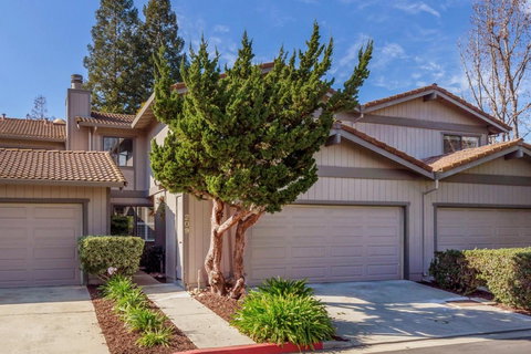 Unbelievable opportunity to own your own home in beautiful Los Gatos with Los Gatos schools! Large Courtstyle town home with a truly amazing backyard. Enjoy your own parklike setting with majestic redwoods, a willow and Japanese maple tree. The traditional floor plan has the living space, dining, kitchen, laundry w/ washer & dryer and 1/2 bath downstairs & 3 oversized bedrooms and 2 full bathrooms upstairs. The owner's suite features vaulted beamed ceilings, a gas fireplace, walk-in closet, double vanities, a huge tiled shower and a private balcony over looking the rear yard. The large front bedroom has vaulted ceilings & a walk-in closet. The beautiful kitchen has an abundance of cherry cabinets and granite counters, high end stainless appliances including refrigerator and wine fridge and a garden window over the sink. Hardwood floors downstairs & louvered shutters though out. Easy access to Courtside Club, Netflix and highway 85. Nice community pool & guest parking across the street!