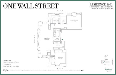 Residence 3601 at One Wall Street is a gracious two-bedroom, two-bath home with an additional powder room offering 2,053 square feet of interior space and dramatic corner exposures. Eastern light fills the primary suite, while broad northern windows brighten the expansive great room, and western exposure from the second bedroom adds another layer of natural light to the home.The kitchen is centrally located and finished with custom Italian cabinetry by Aran Cucine, premium integrated Miele appliances, satin-nickel detailing, and polished natural stone surfaces. Wide-plank French Oak hardwood flooring runs throughout the residence, lending warmth and cohesion to the interiors.The primary bedroom occupies a private corner and includes generous closet storage along with a spa-inspired en-suite bath appointed with natural stone finishes and refined fixtures. A well-proportioned second bedroom is positioned on the opposite side of the home near the second full bathroom, offering flexibility for guests or work-from-home needs, while the separate powder room adds everyday convenience. In-unit washer/dryer, a thoughtfully arranged foyer, and abundant storage complete this exceptional downtown residence.One Wall Street is a meticulously reimagined Art Deco landmark that now stands as one of Downtown Manhattan’s most distinguished luxury condominiums — an adaptive reuse triumph balancing historic craftsmanship with contemporary living.Inside, residents are welcomed by an elegantly appointed lobby, featuring custom finishes and details that echo the building’s storied heritage, along with 24/7 white-glove service.The amenity offering is unrivaled in downtown residential living, anchored by The One Club — more than 100,000 square feet of curated spaces including a private art-filled dining restaurant and bar, demonstration kitchen, indoor pool with wraparound terrace and harbor views, The One Gym and treatment rooms, canine spa, and expansive coworking facilities with podcast suites and conference rooms. Residents also enjoy direct access and priority membership to Life Time Fitness’ expansive on-site club, along with resident-only instructor-led classes, complimentary coffee and refreshments, and dedicated children and teen spaces.At street level, One Wall Street features neighborhood-defining retail, including the first U.S. location of Paris-based luxury department store Printemps, with James Beard Award–winning chef Gregory Gourdet named culinary director. Residents also enjoy direct access to a flagship Whole Foods Market. The landmark Red Room, designed by artisan Hildreth Meière, now stands as a signature retail and dining destination within the building.Perfectly positioned near Battery Park, Tribeca, and the waterfront, One Wall Street sits moments from Downtown’s premier dining and hospitality destinations including The Beekman, Four Seasons Downtown with CUT by Wolfgang Puck, The Tin Building by Jean-Georges, Manhatta, Crown Shy, Overstory, Nobu, Capital Grille, and Stone Street’s historic dining corridor.Transportation is seamless with immediate access to the 1, 2, 3, 4, 5, R, W, J, M, and Z subway lines, the Fulton Transit Center and World Trade Center transportation hubs, PATH trains, ferries, and nearby highway connections.