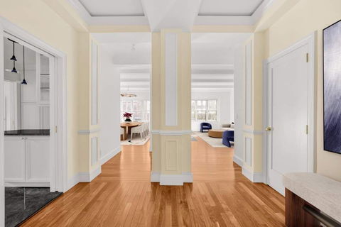 The Foyer features elegant Wall Paneling, refined Crown Moldings, and masterful Coffered-Beamed Ceilings that highlight the home’s prewar character. Brazilian chestnut floors, installed with soundproofing for quiet elegance, flow throughout the residence and lead into the grand layout. Just off the Foyer, a beautifully appointed Powder Room completes the introduction.