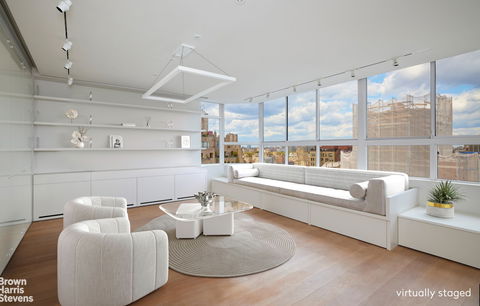 TWO BEDROOM UNIQUE PIED A TERRE IN BOUTIQUE CONDO OFF PARK AVE. Enjoy brilliant sweeping city views from all rooms in this gut renovated two bedroom two bath at the Viscaya Condominium - with a full time doorman/concierge and super. No detail was overlooked. Enter directly off the keyed elevator to arrive at this private floor through residence. Wrap-around windows face north, east and west. Updated and expanded, the Kitchen features high end appliances: Miele Dishwasher and Wall Oven, Wolfe Stove, Sub Zero Refrigerator & Wine Cooler as well as additional refrigerator drawers under the glass topped peninsula counter - a perfect seating area with bonus of cleverly designed storage. A pot filler above the stove, oversized sinks and a designated area at window for herbs and plants are also noteworthy. Adjacent to the kitchen is the Laundry Area with a full sized Miele washer/dryer and access to the service elevator. The Living/Dining Room contains a custom designed built-in sofa that can be opened to provide additional sleeping area if/when needed. There is also abundant well-concealed storage and a projection screen that descends from the ceiling. The Primary Bedroom Suite with open southern views and excellent closet space includes a custom designed built-in queen-size bed with side tables and reading lights. Its ensuite bath boasts a large marble/glass enclosed walk in shower. A mirrored closet and a towel warmer add to the spa-like ambiance. The Second Bedroom also has large wrap around windows and views. The well-appointed second bathroom has a soaking tub. All rooms have remote controlled shades and custom light fixtures. The new lighting system has different modes depending on time of day. There are wide plank hardwood floors and thru-wall a/c throughout. The Viscaya is a superb 21 unit boutique condominium with a prime location just off Park Avenue in the heart of Lenox Hill - one of Manhattan's most upscale and idyllic locations. The 5 story prewar base was built in 1916 and its tower was added in 1982 and includes a roof garden for residents. This can be a perfect personal or corporate pied a terre or primary residence. Pets are permitted. If being used as a primary residence the real estate taxes can be lower.