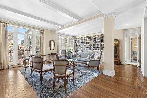 Spacious Elegant Prewar Four-Bedroom or Five-Bedroom with Light, Scale & Timeless Details - One closet is vented for washer/dryer installation! This bright, meticulously renovated residence combines classic prewar character with a modern, functional layout-featuring four bedrooms, three baths, a den/media room, private study/home office, and entertaining areas rarely found on the Upper East Side. A Gracious, Expansive Layout Created from a thoughtful combination of the A and D lines, the home spans three exposures-North, South, and East, affording treetop views to the north and sweeping city vistas to the south. A formal entry foyer with crown molding, cove lighting, and a ceiling medallion opens to a grand living room with soaring beamed ceilings, Juliette balcony, custom built-ins, and generous wall space for art. Entertaining & Everyday Living at Scale Pocket doors connect to the formal dining room, which can accommodate a twelve-seat table and opens to a second Juliette balcony. The adjacent chef's kitchen extends over 30 feet, with cherrywood cabinetry, Fulper tile and custom hardwood floors, Subzero, Miele, and Thermador appliances, a walk-in pantry, and a custom cherrywood banquette breakfast nook. Beyond lies a spacious den/media room with custom millwork, grasscloth wallcovering, ample closets, and a secondary entrance. Private Bedroom Wing A separate hall leads to three secondary bedrooms, each with custom desks and built-ins, complemented by two full baths. Details include bespoke bird's eye maple and anigre woodwork and William Morris wallpaper. Primary Suite Retreat The oversized primary suite offers beamed ceilings, custom storage, and a walk-in double closet. Its marble bath includes cherry and ebony cabinetry and a windowed marble shower. A windowed study/home office, fitted with cherry wood bookcases and desk, completes the suite.