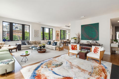 This spectacular TriBeCa loft boasts over 3,200 square feet with four bedrooms and three and a half bathrooms. Through a wide entrance foyer, the sun-flooded great room spans 30'x21' and is peppered with oversized windows with unobstructed views offering corner exposures to the North and West. The living area is adorned with a wood burning fireplace and features high ceilings, creating an open and airy entertainment atmosphere. Adjacent to the large dinin...