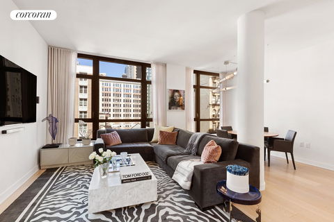 128 West 23rd Street, 8B This two-bedroom, two-and-a-half-bath residence at The Graydon spans approximately 1,427 square feet and offers north and west exposures. Thoughtfully designed for modern living, the home features spacious rooms, 6-inch wide European white oak flooring, and individually controlled high-efficiency heating and cooling throughout. The entry foyer opens into the kitchen, which is outfitted with custom Italian walnut cabinetry by Cesa...