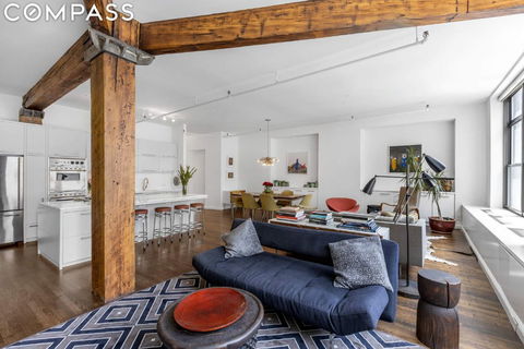 As you enter the apartment through a dedicated foyer with two large coat closets, the main living area of the loft is the perfect spot to entertain, dine, relax and live. Close to 30' in width, and with a span of windows that reach the 10' ceiling height, there is a large dining area with room for a table that easily seats ten, as well as two separate lounge areas and space for a home office. The chef's kitchen is open to the living/dining area, with stainless steel appliances, integrated dishwasher, and a stunning Carrara marble island which is the focal point of this beautiful space. The loft's most remarkable architectural features are the original oak columns and beams with hand forged iron joinery, creating a dramatic industrial feeling.