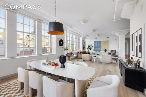 Situated at 145 Hudson Street, one of Tribeca’s iconic addresses, this expansive 4 bedroom loft epitomizes the essence of sophisticated downtown living. Sky Lofts is a sought-after building known for its industrial charm, and stunning city views, making this property a rare opportunity in a prime location. Spanning 3,300 square feet, this four-bedroom, three-and-a-half-bath home boasts over 11-foot ceilings and an inviting, open layout. The apartment’s ri...