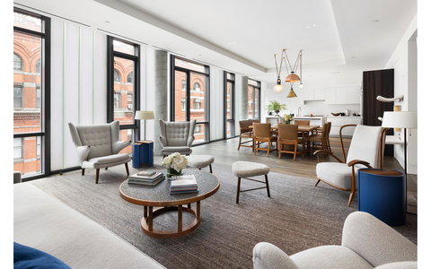 Deeded Parking Space Included with Residence. For the discerning buyer. Welcome to this rarely available south facing four bedroom+ residence in the heart of prime Tribeca on an historic cobblestone street. This quintessential home offers contemporary luxury in a boutique condominium with only six residences, in one of Manhattan's most storied neighborhoods. With a private keyed entry to this magnificent full floor, the layout lends itself to comfortable living. A dreamy home by acclaimed architect Wayne Turett, and then reimagined by the distinguished designer Shawn Henderson, allows for grand entertaining. The stunning open living and dining space offers 60 linear feet of frontage and a wall of five oversized windows alternating with Channel Vision glass, allowing all day light and views of Leonard Street. To complement the living space there is clean-burning fireplace with steel facade. Matching custom steel doors lead you to a cozy soundproofed den, perfect for watching games, or reading and relaxation. The custom kitchen with Dornbracht fixtures features the finest appliances: a 48" Subzero side-by-side refrigerator, 24" inch under-counter wine cooler and a 24" Bosch dishwasher and an oversized island. The kitchen is completed with custom Italian matte white lacquer mixed with stained oak wood cabinetry. Additional cabinetry was then added to enclose a second full size Wolf wine refrigerator and add additional storage, an envious kitchen design for any chef. The primary suite has a five-fixture windowed bathroom with a deep soaking tub, double-integrated Boffi sink, limestone walls, and radiant heated flooring. The primary also features an enormous walk-in closet, and your own private terrace. To complete the home there is a fitness room that doubles as a bedroom with a murphy-bed, aa spectacular custom outfitted library, and a hidden laundry room with full size washer and condensation dryer. Superb highlights include custom designed light fixtures, state of the art Sonos sound system, inlaid speakers, Lutron shades, new 7.5" oak floors and pocket doors throughout. This rare home also includes a deeded parking space offering its owners convenience and discretion. A generous storage unit is transferred upon sale.15 Leonard is pet friendly and offers extremely low monthlies for a residence of this caliber and location.