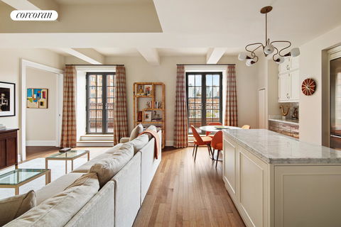 Nestled within the Greenwich Lane condominium, this rare, one of a kind, north-facing one-bedroom, one-and-a-half-bath residence offers approximately 1,158 square feet of interior space along with a 327-square-foot terrace showcasing skyline and Empire State Building views. Designed by Thomas O'Brien, the interiors reflect a refined balance of comfort and classic detail. A distinctive painted steel door opens into an entry foyer leading to a well-proportioned living room with large double-hung mullioned windows, rich hardwood floors, oversized windowed doors, and a beamed ceiling. Off the foyer are a powder room and a utility closet with an LG washer and dryer. The home features a four-pipe HVAC system with zoned climate control. The full-length terrace, accessible from both the living room and the primary suite, overlooks West Village townhouses with the Empire State Building beyond. The open kitchen is equipped with Sub-Zero, Wolf, and Miele appliances. White marble spans the island, countertops, and tile backsplash, complemented by custom cabinetry with stainless steel hardware. The primary suite includes a walk-in closet and an ensuite bathroom with custom marble mosaic floors, an under-mounted soaking tub with marble surround, a glass-enclosed shower, and a custom millwork vanity topped with marble. Greenwich Lane is a LEED-certified condominium designed by FXFOWLE Architects with interiors by Thomas O'Brien. Centered around a landscaped private garden, the development provides a comprehensive amenity suite including a fitness and wellness level with yoga and treatment rooms, a 25-meter pool with hot tub, a golf simulator, 24-hour attended lobbies, a lounge, dining room with catering kitchen, 21-seat screening room, children's playroom, bike storage, and resident storage. Located within the Greenwich Village Historic District, the home is close to neighborhood landmarks, dining, shopping, and outdoor destinations including Washington Square Park, Union Square, Hudson River Park, and the High Line. Transit options include the B/D/F/M, L, 1/2/3, A/C/E, PATH, multiple bus lines, and CitiBike.