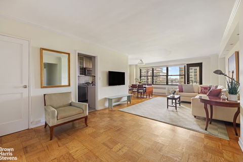 LUXURIOUS TWO-BEDROOM WITH BREATHTAKING WATER VIEWS An exceptional opportunity awaits in the coveted Lincoln Towers community. Beautifully renovated, this expansive two-bedroom, two-bath residence combines elegance, comfort, and functionality. From the moment you enter, natural light pours through a wall of west-facing windows, highlighting the thoughtful upgrades-soaring wood doors, custom closets, and crown molding-that make this home truly special. Perched on the 10th floor of 165 West End Avenue, the apartment offers sweeping Hudson River views as well as tranquil vistas of Lincoln Towers" private gardens and lush treetops. A private balcony of over 19 feet extends your living space outdoors-an idyllic retreat for morning coffee, alfresco dining, or enjoying dramatic sunsets. The kitchen is both stylish and practical, offering abundant storage and top-of-the-line stainless steel appliances. The spacious living/dining room provides a flexible layout, equally suited for large gatherings, quiet evenings, or a dedicated work-from-home setup. Storage is exceptional, with eight closets-several customized to maximize space and organization-throughout the home. The serene west-facing primary suite includes a custom wall of shelving, an extended desk, an upgraded en-suite bathroom, and a separate dressing area with vanity. The oversized second bedroom is equally impressive, featuring a large window with river views a generous custom closet and plentiful natural light. Residents enjoy a full suite of amenities, including a 24-hour doorman, live-in superintendent, fitness center, library, children's playroom, central laundry, package room, bike and storage rooms (waitlist), on-site dry cleaner, parking garage, and a convenient circular driveway. Maintenance includes gas, heat, and electricity. At 165 West End Avenue, you'll also enjoy exclusive access to a beautifully landscaped private park with gardens, playgrounds, picnic tables, basketball and pickleball courts, and ample recreation. Perfectly situated near Lincoln Center, Riverside and Central Parks, Time Warner Center, fine dining, shopping, theaters, multiple bus lines and the subway, this home places the best of the Upper West Side at your doorstep.