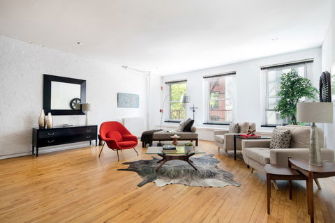 If you are looking for a real loft in prime SoHo, your search is over. Located at the crossroads of Spring Street and West Broadway, this big, bright and beautiful loft boasts high ceilings, exposed brick walls, a full-floor gracious floor plan and character galore. Filled with palatial potential, the expansive living, dining and kitchen faces south with stunning light and charming SoHo and leafy tree-top views. The open chef's kitchen with stainless steel appliances has a butcher block wood and granite island with seating for 4 and a hip cool bar area with wine refrigeration. The living room has a built-in window seat with additional storage. The large dining area and open living room are perfect for entertaining. A gallery hallway leads to the bedroom wing and features built-in bookshelves with cabinets and large walls for art. The master bedroom features an en-suite bath with double sinks, built-in linen closet, walk-in shower and a colossal walk-in closet - move-in ready for a SoHo shopping spree. The second over-sized bedroom can accommodate two twin beds or a king-size bed and has ample closet space as well as a built-in display shelving. Both bedrooms have light with quintessential quiet SoHo views. There is a second full bath with a soaking tub, full-size vented washer/dryer, a super-sized large storage closet and a bonus built-in office area with bookshelves.This intimate cooperative building features keyless door and elevator entry and video intercom security. Enjoy fashion, food and fun in the heart of historic SoHo with its small cafes, boutique shopping and fine dining. Convenient to east and west transportation. An exceptional find with real value and extremely low monthly carry. Large loft living simply doesn't get better than this! Move right in and design your dream loft.
