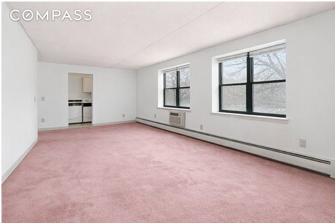 This corner two-bedroom home offers large bedrooms, a separate kitchen, an over-sized living room with dining area, and several closets and windows throughout.
