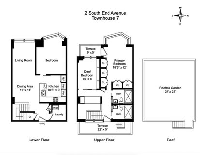 Welcome home to Townhouse 7 at The Cove Club. This uniquely designed duplex offers 1,429 Sq Ft of interior living and over 700 Sq Ft of outdoor entertaining. This three-bedroom residence enjoys Western Exposures offering views of the dazzling Hudson River and amazing sunsets. This home has a gracious layout, perfect for entertaining and is the epitome of luxury living.This warm and inviting home, thoughtfully designed has an open living and dining area that boasts oversized windows that flood the apartment with light and offer lush tree-top views. There is currently a bedroom on the first floor that can be easily removed to create an even more expansive living/dining setup. The open chef's kitchen is outfitted with custom Zebra wood cabinets and equipped with top-of-the-line SubZero, Thermador, Bosch & Miele appliances. The unit has poured concrete floors throughout On the upper level a generous master suite with large balcony offers river and park views and enjoys ample closet space. This home is outfitted with a W/D in unit as well.The second level of this home leads you to the primary bedroom that is flooded with natural light and features its own private terrace. The primary bedroom also includes an abundance of custom milled closets. There are also two spa quality bathrooms featuring handmade Ann Sacks glass tiles and towel warmers. Also located on the second floor is another bedroom that can be used as a nursery, home office or guest room.Up the stairs you can find your private 646 Sq Ft rooftop oasis is perfect for enjoying the beautiful Hudson River views and sunsets over a meal and a glass of wine. This immaculately landscaped terrace includes planter boxes, proper irrigation and custom furniture throughout. This apartment is virtually staged.This wonderful townhouse is located in the Cove Club, a full-service luxury condominium situated in a quiet cul-de-sac alongside South Cove Park and the water's edge. Residents enjoy 24/7 doormen, gym, lounge with WIFI and billiard table, expansive roof deck, large central laundry room, planted courtyard, and garage. The Cove Club is steps from the bike path, playgrounds, Gristedes, restaurants, Whole Foods, and Brookfield Place. The Rector St Subway Station lines are a quick walk where you can catch the 1, N, R or W or the Wall St Station for the 4 and 5 trains.The current assessment is $179.26 for this unit.Call us to schedule a showing.