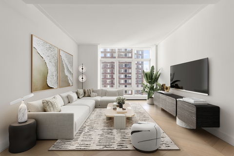 A masterfully conceived, triple-mint residence spanning 2,437 square feet, this home is defined by grand proportions, luminous interiors, and impeccable finishes throughout. A gracious foyer and gallery open into an expansive living and dining area with over 10-foot ceilings, floor-to-ceiling east-facing windows, and chevron-patterned French white oak floors, framing serene morning light and skyline views. An entertainer's showpiece, the expansive eat-in kitchen blends sculptural marble with bespoke Italian craftsmanship. Honed Calacatta marble, custom Italian oak cabinetry, and brushed nickel accents are complemented by seamlessly integrated Sub-Zero, Wolf, and Miele appliances and a marble-clad, vented hood. The corner primary suite is a private sanctuary, offering the serenity and indulgence of a five-star retreat. Three closets and a spa-quality bath feature radiant Iceberg marble floors, Calacatta Cielo walls, a soaking tub, walk-in shower, and dual-sink vanity. Two additional bedrooms each include en-suite baths, while a glamorous powder room showcases Saint Laurent marble, a hammered metal sink, and Murano glass accents. Residents of 200 Amsterdam enjoy an unparalleled lifestyle defined by resort-caliber amenities and white-glove service. Offerings include a 75-foot saltwater pool, Wright Fit fitness center, spa with sauna and steam rooms, golf simulator, club lounge, landscaped terrace, library, rehearsal room, and a Lincoln Center-inspired children's playroom, all supported by full-service staff and LIVunLtd lifestyle services.