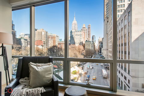 Overlook historic Madison Square Park from a rarely available 2-bedroom, 2-bath residence at the coveted One Madison. The 31-foot long living/dining room and master bedroom suite feature 10-foot floor-to-ceiling glass windows that showcase breathtaking views of Madison Square Park and the Midtown skyline. The luxurious master bedroom features a generous closet/dressing area and en-suite travertine marble bathroom with radiant heated floors. This residence also features a secondary bedroom facing south and an adjacent Calacatta Gold marble bath. Enjoy the superb open chef's kitchen with rosewood cabinets with honed Calacatta marble countertops and Gaggenau appliances. A Bosch washer/dryer, central HVAC, and 9-inch rift and quarter sawn solid white oak flooring complete the picture.