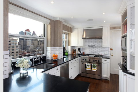 Sun-filled and impeccably renovated, this four bedroom apartment, with four full baths, strikes a perfect balance of elegant entertaining as well as gracious and comfortable living. Enter into the proper foyer off which you have the sunny and house-like eat-in kitchen with top of the line appliances and an enormous pantry closet. Also off the foyer is currently a library/den which could easily act as a fourth bedroom. The impressive double sized square living room/dining room has custom built-ins as well as a wall of windows. Its beautiful scale is ideal for both entertaining as it is a quiet night at home. One of the four full baths is perfectly located off of a hallway to the living room and serves as a powder room for guests. The master bedroom is located in its own wing of the apartment and is complete with separate dressing area, enormous walk-in-closet, and classically renovated bath. Flanking the other side of the apartment are two additional bedrooms each with en-suite baths. Notable features include vast closet space/storage, pre-war detail, custom built-ins throughout, and north/south/east exposures with open city views. The building is full service, pet friendly, and permits 75% financing. This is a must see! CONTRACT SIGNED.