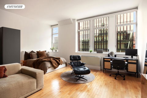 Residence 5B at the iconic 25 SoHo is a sun-filled 838-square-foot loft defined by soaring 11-foot ceilings and dramatic oversized windows overlooking West Houston Street. Currently configured as a spacious studio, the residence offers the flexibility to be converted into a true one-bedroom layout (see alternate floor plan). The open kitchen is outfitted with a premium suite of appliances, including a Sub-Zero refrigerator, Viking range and oven, Miele dishwasher, wine refrigerator, built-in microwave, and garbage disposal-ideal for both everyday living and entertaining. The well-appointed bathroom features a deep soaking tub and generous vanity, while the gracious layout provides abundant storage throughout, complemented by the convenience of an in-unit washer and dryer. SoHo 25 is a boutique, full-service condominium comprised of just 32 residences, ideally positioned in the heart of SoHo. Building amenities include a 24-hour doorman and concierge, package room with cold storage, a newly renovated lobby, and a beautifully landscaped roof deck with open city views. Moments from the B, D, F, M, A, C, E, and 6 subway lines, and a short walk to the Hudson River Greenway, world-class dining, shopping, and nightlife, the location is simply unmatched. As of Jan 2026: Assessment of $95.57/mo until September 2029 for roof work which has already been completed.