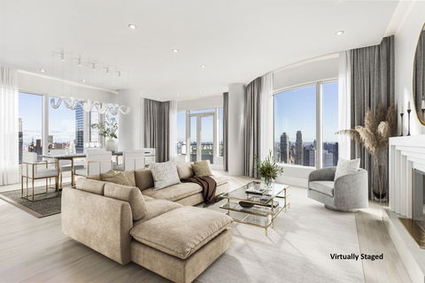 With interiors by Daniel Romualdez, this beautifully appointed 3 bedroom/3.5 bath, 2,621 sq ft home is highlighted by oversized windows offering north and west exposures with expansive city views which include Central Park. The vast 30' living/dining room wrapping the northwest corner has 11' ceilings and a balcony. The west facing windowed eat-in kitchen, custom designed by Daniel Romualdez and Eggersmann, has deluxe finishes including HanStone glass quartz countertops and backsplash, walnut cabinetry, Miele appliances: vented five-burner gas cooktop, wine refrigerator, dishwasher, two ovens (one with microwave & convection), and a 33" Kohler Stages Collection sink. The oversized primary bedroom has a huge dressing room adjacent to the second closet and a spacious windowed en-suite master bath with polished white Nanoglass walls, radiant heat floors, walnut vanity with white Nanoglass top, custom designed 6 foot bathtub, glass enclosed shower with rain, side mount, and hand-held shower heads, and a glass enclosed Toto water closet. The spacious second and third bedrooms have en-suite baths. Other unique characteristics include a gracious entry gallery, white oak floors, four pipe ceiling hung HVAC system with linear diffusers, an Asko washer and vented dryer, THG and Dornbracht fixtures, and three apartments per floor. 252E57 Luxury Amenities include: Gated Porte Cochere, Automated Parking Garage (licenses available for purchase), 75-foot Swimming Pool, Spa with Hydrotherapy Circuit including steam, sauna, ice, and relaxation rooms, State of the Art Fitness Center with Pilates, Spinning & Yoga, Lounge, Library, Billiards Room, Screening Room, Conference Room, 70-foot South Facing Terrace, Dining Room, Breakfast Room, Catering Kitchen, Furnished Guest Suites, Playroom, Dog Play Space & Grooming Station, Bicycle Room, Storage Units for purchase, and Concierge Services provided by Luxury Attache. There is a current assessment in place of $1,670/month.