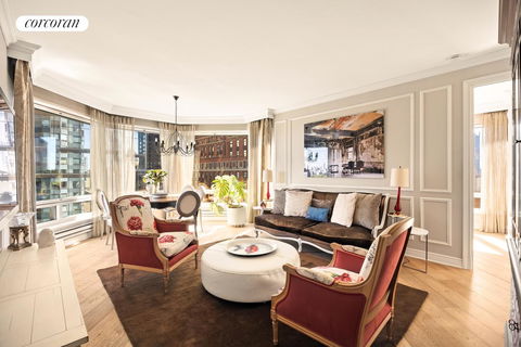 Perched above Columbus Circle, this beautifully renovated 2-bedroom, 2-bathroom residence was reimagined by its designer–architect owner. Bathed in natural light, it offers sweeping 180° views of Central Park, the city skyline, and beyond. A refined sense of craftsmanship defines the home. French white oak wide plank diagonal floors and crown molding lead to a custom kitchen with bespoke cabinetry, a French farmhouse sink, Wolf range and microwave, panele...