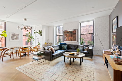 Bespoke, corner loft in prime NoHo featuring sunny southwest exposures overlooking Mott and Bleecker Streets. Enter this exceptionally renovated home through a 40' long gallery complete with a full wall of custom milled oak cabinetry concealing five large closets plus a workstation and bench seating with large storage drawers. At the end of the gallery, the original post and beam structural columns and new herringbone oak floors lead you through the chef's...