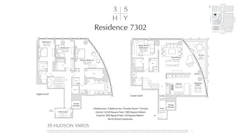 Ultra-Luxury Furnished High-Floor Four-Bedroom Duplex with Terrace & Hudson River Views Offered fully furnished, this extraordinary high-floor four-bedroom duplex residence at 35 Hudson Yards showcases sweeping skyline and Hudson River views, soaring 10'10" ceilings, and elegant wide-plank French oak floors throughout. The lower level is thoughtfully designed for both living and flexibility, featuring a gracious Great Room that opens directly to a 203 SF private terrace, ideal for indoor-outdoor entertaining. The windowed eat-in kitchen is appointed with bespoke Smallbone of Devizes cabinetry, opal white marble countertops and backsplash, and a full suite of Gaggenau appliances including a wine refrigerator and coffee maker. Also on this level is a large media room, which easily converts to a fourth bedroom and already includes an en-suite bath, as well as a gear/storage room, an onyx-clad powder room, and side-by-side washer/dryer. Upstairs, the home offers three bedrooms, including a stunning corner primary suite with a spacious walk-in closet and spa-like windowed bath wrapped in iceberg quartzite, featuring a double vanity and deep soaking tub. Two additional bedrooms, both en-suite, complete this level, one of which is currently configured as a home office. An incredibly rare interior elevator seamlessly connects both floors, adding convenience and a true sense of townhouse-style living in the sky. Designed by David Childs/SOM, with interiors by AD100 designer Tony Ingrao, 35 Hudson Yards offers an unparalleled lifestyle. Residents enjoy direct access to the Equinox Club and Spa with indoor and outdoor pools, SoulCycle, the Equinox Hotel, and Electric Lemon by Stephen Starr. Over 22,000 SF of private amenities include a fitness center, yoga and meditation studios, cocktail lounge, screening room, golf simulator, and riverfront dining terrace.
