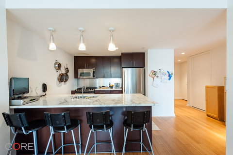 Conveniently located in Midtown West, this well laid out, split two-bedroom apartment features a generous living and entertaining space. The well-appointed, made-for-cooking open kitchen has Wenge wood cabinets, Statuary marble countertops, stainless steel appliances, and an island with an overhang for bar stools. The two bathrooms are outfitted with deep soaking tubs, frameless glass shower enclosures, mosaic glass tile and rich Bianca Verde marble counte...