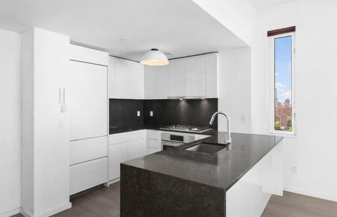 The unit features floor-to-ceiling windows, capturing natural light and offering sweeping south western views. The open concept kitchen, equipped with white Italian lacquer cabinetry, marble counter-tops, and high end appliances, as well as ample storage space, delivers understated-elegance and effortlessly blends style and convenience. The property also boasts a luxurious bathroom and in-unit vented washer/dryer.