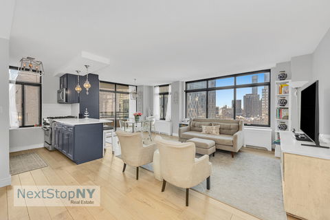 Residence 2501 at The Kingsley Condominium is a move-in-ready 1-bedroom, 1.5-bath home offering space, light, and open southeast city views from a high floor. The gracious layout is complemented by wide-plank hardwood floors and oversized windows that bring in excellent natural light throughout the day. The expansive living and dining area easily accommodates both lounging and dining and opens directly to a large private balcony, ideal for outdoor dining or relaxing above the city. The open, windowed kitchen has been thoughtfully renovated with rich navy cabinetry, quartz countertops, stainless steel appliances, and generous storage-designed to function beautifully for everyday living and entertaining. The primary bedroom comfortably fits a king-sized bed and offers ample closet space. The en-suite bath has been fully renovated with contemporary finishes, while a stylish powder room off the entry provides added convenience for guests. The Kingsley is a full-service condominium offering a 24-hour doorman, concierge, live-in resident manager, a well-equipped fitness center with panoramic city views, laundry on every floor, and an on-site garage. Conveniently located near transportation, dining, and shopping, this residence offers a turnkey opportunity in a well-established Upper East Side building. All information furnished herein is from sources deemed reliable. All information is submitted subject to errors, omissions, change of price, prior sale or lease, or withdrawal without notice. All dimensions are approximate. For exact dimensions, please hire your own architect or engineer.
