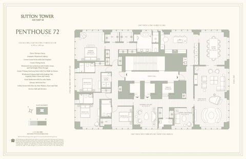 Commanding an entire floor, Penthouse 72 at Sutton Tower offers a truly breathtaking vantage point with uninterrupted 360-degree views of New York City’s skyline, rivers, and iconic landmarks. Designed by renowned architect Thomas Juul-Hansen, this sprawling 4,765-square-foot residence features 4 bedrooms and 4.5 baths, with every room oriented to maximize light, space, and the city’s ever-changing vistas. Direct elevator access opens into a dramatic great room with soaring 15-foot ceilings and southeastern exposure, framed by floor-to-ceiling windows that flood the space with natural light. The north-facing kitchen is a showpiece, featuring a Statuarietto marble island, Italian matte lacquer cabinetry, and a full suite of Sub-Zero and Wolf appliances, seamlessly connected to a formal dining room with sweeping northeastern views.