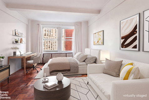 Situated on the quiet backside of the building, this charming studio offers peaceful north-facing city views, a thoughtfully renovated kitchen, and low maintenance. The kitchen is outfitted with a full-size stainless steel dishwasher and refrigerator, Corian countertops, wood cabinetry, and an extended eat-in counter with room for 2 stools. The living area showcases classic Art Deco details, including walnut stained herringbone hardwood floors, beamed ceilings, and oversized windows that bring in abundant natural light. A huge walk-in closet offers ample storage with hanging storage and sliding drawers. The Art Deco bathroom features classic black-and-white tile, a pedestal sink, and white subway tile. Designed by renowned Art Deco architects Sugarman & Berger (The New Yorker Hotel, 1 Fifth Avenue) this well managed building allows pied-à-terres, pets, and unlimited subletting after 3 years. Amenities include 24-hour doorman, 3 elevators, a laundry room, live-in super, package room, storage units, bike storage, laundry and dry-cleaning drop-off service, and a roof deck scheduled to reopen soon. Ideally located in the heart of Hudson Yards and Manhattan West, the building is moments from Whole Foods and world-class dining, including The Peak, Ci Siamo, Zou Zou's, Estiatorio Milos, and Locanda Verde, as well as popular cocktail lounges such as Chez Zou, Bar Pendry, Electric Lemon, and Bar Primi. Nearby attractions include the High Line, the Shops at Hudson Yards, the Vessel, The Shed performance venue, and excellent transportation options, including the 7 train, A/C/E lines, Penn Station, and Moynihan Train Hall. Assessment of $ 104.35 per month through October 31, 2029 for capital improvement projects.