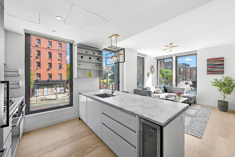 Modern Elegance in a Landmark Boutique Condominium in the East Village Perfectly situated at the nexus of NoHo, the East Village, and the Bowery, this corner two-bedroom, two-bathroom residence in a Morris Adjmi-designed boutique condominium offers both investors and end-users a rare opportunity: architectural integrity, prime location, and turnkey luxury in one of Manhattan's most dynamic, historically rich neighborhoods. Thoughtfully designed and immaculately maintained, this light-filled home spans over 900 square feet, with 9-foot ceilings, eight oversized casement windows, and wide-plank white oak floors throughout. A central VRF system provides high-efficiency zoned climate control, while motorized shades and a custom audio system elevate everyday living. The residence also includes an in-unit Bosch washer and dryer and a private storage locker, maximizing functionality and convenience. Ideal for both full-time living and long-term investment, the open-concept layout features a generously proportioned living and dining area with sunny southern and eastern exposures. The windowed chef's kitchen is finished with custom matte cabinetry, marble slab countertops and backsplash, and a full suite of Miele appliances-a timeless, high-performance package that supports both daily use and lasting resale appeal. The primary suite features a custom walk-in California Closet and an elegant en-suite bath with stone tile, a glass-enclosed shower, and a double vanity framed in blackened steel. The second bedroom, equally well-appointed, sits across from a full bathroom clad in terrazzo tile-offering flexibility for guests, children, or home office needs. Residents of 45 East 7th Street enjoy an intimate collection of homes within a thoughtfully conceived building offering curated amenities, including a 24-hour attended lobby, a state-of-the-art fitness center, a tranquil landscaped garden, and an elevated rooftop terrace with panoramic views of Manhattan's skyline. For primary residents, this location offers unmatched access to some of Manhattan's most beloved parks-Washington Square, Tompkins Square, Union Square-as well as the cultural, culinary, and commercial richness of Greenwich Village, SoHo, Nolita, the Lower East Side, and Gramercy. For investors, the property sits in a high-demand rental corridor with strong historic appreciation and limited new development inventory. The building's boutique scale and architectural pedigree further enhance its desirability and long-term value. Proximity to major transit lines-including the 4/5/6, L, N/Q/R/W, and F trains-ensures connectivity and convenience, whether for daily commuting, future resale, or premium rental positioning.