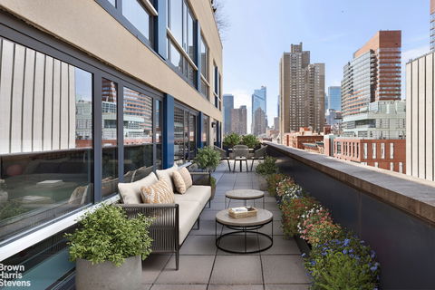 OVER 700sf OF OUTDOOR SPACE INCLUDING MASSIVE 588 sf MAIN TERRACE Presenting Apartment #7A, a gorgeous sun-drenched 3 bedroom, 3.5 bathroom home with magnificent outdoor space. This perfectly maintained and move-in ready apartment is an absolute showpiece. Step into an elegant entry hallway, lined with large dramatic windows, that leads to an impressive and stylish living room. The space is flooded with light from a wall of windows, leading directly to the remarkable 588sf main terrace, ideal for hosting impressive gatherings. In total, the home boasts over 700 square feet of outdoor space. The spacious kitchen, open to the living room, features top-of-the-line Viking and Bosch stainless steel appliances, a Caesarstone countertop, and sleek Poggenpohl cabinetry. The generous dining area is perfectly located adjacent to the living room. The oversized primary bedroom includes not one but two expansive walk-in closets. The luxurious primary bathroom offers a soaking tub, steam shower, and double sinks. The second bedroom has direct access to the main terrace, while the third bedroom enjoys its own private balcony with breathtaking city views. Both of the secondary bedrooms feature en-suite bathrooms, and there's a stylish powder room for guests. All bathrooms are equipped with radiant heated floors. Every room is filled with wonderful natural light and other highlights include a W/D, an updated mini-split air conditioning system, remote-controlled shades, 9" ceilings, a wet bar, and beautiful oak flooring. Plus, a large deeded storage unit is included with the apartment! Griffin Court is a full-service, pet-friendly condominium offering a 24-hour doorman, live-in superintendent, state-of-the-art fitness center, and a beautifully landscaped 8,000+sf, two-level common courtyard. Ideally located in prime Hell's Kitchen, this residence is close to top restaurants, Columbus Circle, Central Park, supermarkets and multiple transportation options, including access to the A/C/E/B/D/N/Q/R/W/1 trains.
