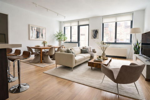Experience the Oculuss "E" linethe buildings most efficient two-bedroom split layoutfeaturing a private balcony overlooking the quiet interior courtyard. This offering includes an unmatched value proposition: a rare, oversized deeded basement storage room (a transferable asset valued at over $50,000) included in the sale. The 1,265-square-foot floor plan is optimized with a sophisticated split-bedroom design, ensuring zero wasted space and absolute privacy.The expansive living area flows into an open chefs kitchenan ideal setting for both intimate dining and entertaining. Enhanced by new, light-colored wooden flooring that reflects the natural light, the culinary space is anchored by a breakfast bar, custom-milled Poggenpohl cabinetry, quartz counters, and a suite of premium integrated appliances, including a high-performance Viking refrigerator and wine cooler. A floor-to-ceiling glass door leads to your private balcony, where you can enjoy morning coffee or evening cocktails overlooking the buildings quiet and tree lined interior gardens.The intelligent split-bedroom layout ensures maximum privacy and acoustic separation between bedroom suites. The king-size primary retreat features a spa-like en-suite bathroom with radiant heated floors, a glass-enclosed steam shower, and a deep soaking tub with Kohler fixtures. A walk-in closet is expertly outfitted with custom Elfa shelving and is complemented by a free-standing Ligne Roset wardrobe. The second bedroom similarly overlooks the tranquil courtyard and provides easy access to a second full bath.Beyond the interiors 1,265 square feet, this residence offers a level of utility rarely found in Manhattan boutique condos. The included deeded basement storage room is a significant financial asset that distinguishes this home from other active listings. This unit is further completed by a newly installed high-capacity vented Washer & Dryer.The Oculus is an award-winning boutique condominium known for its striking terra cotta faade and oversized windows. The building includes a 24-hour doorman and a live-in resident superintendent. Residents enjoy a landscaped roof deck with views of the Empire State and Chrysler buildings.Perfectly situated at the crossroads of Flatiron, Chelsea, and Union Square, The Oculus is seconds from the Union Square Greenmarket, West Side Highway parks and world-class dining.*Some of the photos have been staged.**Stated Taxes include NYC Condominium Tax Abatement for a primary residence. Please verify eligibility at nyc.gov