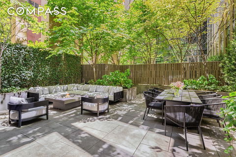 Outdoor living is equally impressive, with a private courtyard designed by Hollander Design for relaxation and entertainment. The space includes a fire table and fluted glass panels, creating a serene escape from the city’s hustle and bustle. The lush landscape adds to the tranquility, making it the perfect spot to unwind.