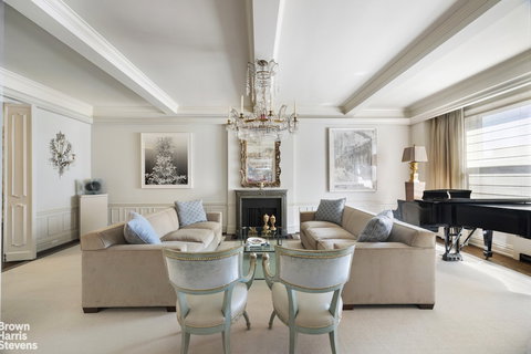 For the first time in over 75 years, this grand 9 room home with stunning renovations throughout, is now on the market. From a semi-private landing, the door opens to a 24' gallery, a most gracious introduction to this superb layout that offers beautifully proportioned rooms and 10' ceilings. Straight ahead is the grand living room which opens to an equally grand formal dining room thereby creating a seamless flow for the most sophisticated of entertaining spaces or, quite simply, an incredibly generous space for daily living. Just beyond, is an oversized kitchen, spectacular in every way, from large center island, marble countertops, top-of-the-line appliances, abundant storage, and a custom-designed banquette and home office area. No detail was overlooked. Privately situated on the opposite side of the residence is the bedroom wing comprised of four generously scaled bedrooms, each with jumbo walk in closets and built-ins. A separate fifth bedroom and bath, discreetly located off the kitchen, offers exceptional versatility for staff, guests or a home office. This residence is beautifully maintained and further enhanced by marvelous light through its southern and eastern exposures. Classic pre-war details such as refined moldings and beautiful herringbone hardwood floors add warmth and character to every room. Additional aspects include wood burning fireplace, cove lighting, dedicated laundry room and abundant customized closets and storage. Built in 1927 and designed by the esteemed architectural firm Schwartz & Gross, this premier Park Avenue cooperative is celebrated for its stunning lobby and level of service. Residents enjoy 24-hour doorman, live-in resident manager, highly attentive staff, state-of-the-art fitness center, half-court basketball court, bike room, common laundry, and private storage. Pets are welcome. Financing up to 50% is permitted, and flip tax is payable by the purchaser.