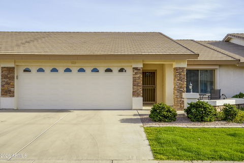 Golf course condo with beautiful Superstition Mountain views. 2 bedrooms, 2 bathrooms, 2 car garage in active 55+ adult community of Sunland Springs Village. Open ''great room'' layout for living room, dining, kitchen. New paint throughout the unit, luxury wood-style vinyl flooring in living area, master and guest bedrooms, tile flooring in traffic area, dining area,kitchen and both bathrooms. 2022 new A/C heat pump, water heater and soft water system, built-in cabinets in the garage! This property is ready for you to move in and enjoy! Community amenities include 27 hole golf course, tennis courts, pickle ball, heated swimming pools and much much more. Make the move, you won't regret your decision!