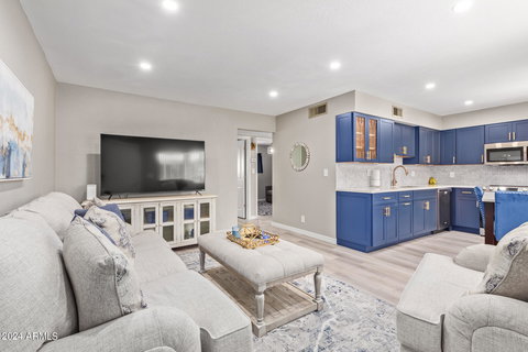 Seeking the ideal home? This fully renovated 2-bedroom townhouse in the 55+ Sarkis East Community fits the bill. Step inside to find a stunning living area with wood-look tile flooring, a calming color scheme, and contemporary recessed lighting. The kitchen is a standout, boasting trendy blue cabinetry with glass-fronted cupboards, a stylish mosaic backsplash, sleek granite countertops, and stainless steel appliances. Two cozy bedrooms offer ample closet space for easy organization. And don't forget the fantastic community pool, perfect for summer entertainment. Don't miss out—act now!