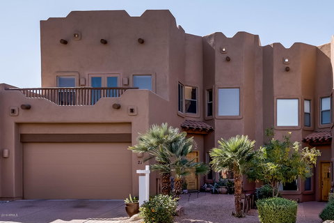 Beautiful upgraded townhome located in a small private gated complex within Red Mountain Ranch Masterplanned Community, featuring: public golf course, tennis courts, workout facilities, swimming pool, & multiple parks/play areas. This spacious townhome backs up to grassy common area from the privacy of the back patio. It is a rare 3 master bedroom floor plan (1 downstairs and 2 upstairs), all with walk-in closets, balcony w/ views and private bathrooms. Upgraded kitchen and family room tile flooring, faux wood beams and upgraded lighting. Freshly painted inside! Upstairs LOFT is perfect for game area or office. Arizona sunsets are in full view from the back patio. Enjoy the private community pool/spa or walk over to the driving range, tennis courts or community clubhouse. All a short walk!