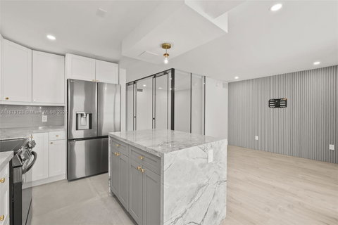 Welcome to this beautifully renovated 2 BD, 1.5 BA condo that combines contemporary design with functionality. The layout boasts abundant natural light from large south facing windows w/ light flooring throughout. Highlighting sleek finishes, the kitchen features quartz countertops with a center waterfall island, custom white cabinetry with brass hardware, and high-end LG stainless steel appliances. The living room is inviting with a convenient built-in TV mount, and adjacent to it is a flex bedroom enclosed with striking glass walls offering versatility—perfect for an office, studio, or guest space. The spacious primary offers large built out closets with a private balcony over looking Lincoln Rd. Ideal for owners looking to live year round or investors looking to rent out immediately.